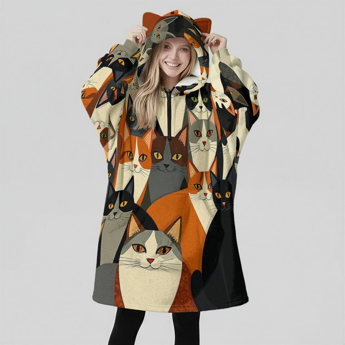 Cats Fleece Oversized Hoodie Blanket With Decorative Ears
